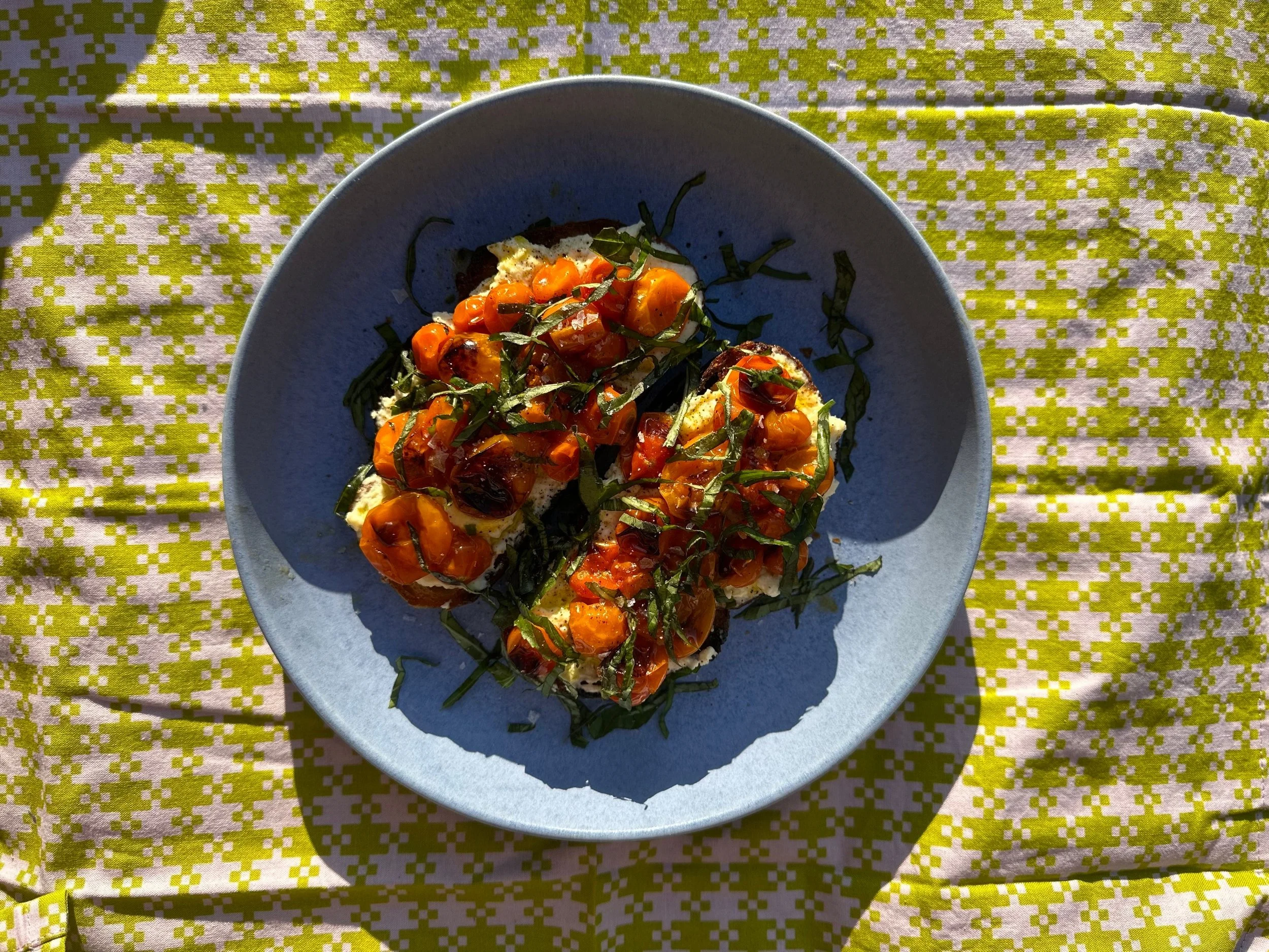 Cherry Tomato Toast May 17 Written By Sammi Ledbetter Ingredients:Cherry TomatoesEVOOSeasoning: Salt, Pepper, Garlic PowderHerbs: Basil, OreganoSourdough Bread Sammi Ledbetter